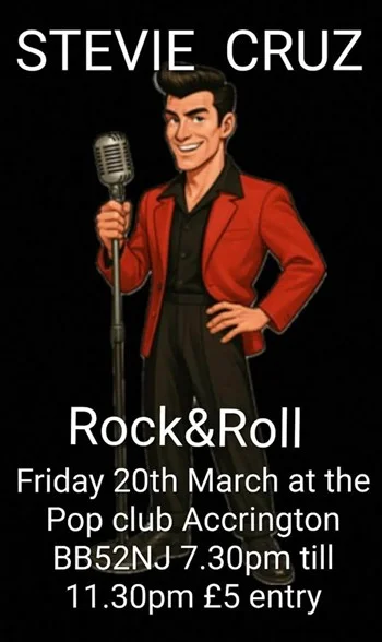 Stevie Cruz is one of the UK’s standout rock ’n’ roll performers, known for his powerful vocals, upbeat rhythm, and dance‑floor‑driven sets. His shows blend classic jivers, stroll favourites, and rockabilly energy, creating a vibrant night perfect for dancers and rock ’n’ roll fans alike.